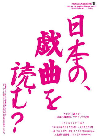 TTC(仮称)公演稽古はすでに始動している。リーディングだ。なーんと「ほぼ六週連続」でふるぅーい、日本の戯曲を六編読む。劇団員だけでは手が(口も)足りないので、幸地優子さんを筆頭にナレーターを数名、ゲストに迎えて次々と読む。ただただ読む。